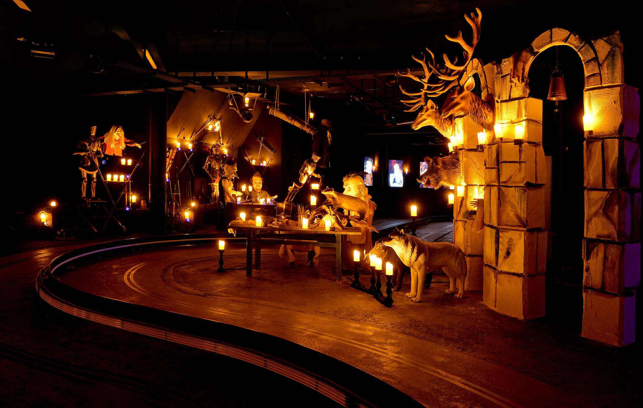 During the ride, visitors will discover the ghost life in the castle by lighting candles using a special interactive matchstick, in nine different scenes. The candles are lit by hitting targets (160 targets have been installed). The passengers in the vehicles must work as a team to light all the candles and collect as many points as possible. In return for lighting all the candles, they are rewarded with stunning black light scenes, featuring ghosts, beautiful scenery and other special effects. The more candles that are lit, the more the scene will reveal and visitors can enjoy the beautiful scenes. But beware: each candle flickers for only a few seconds … The final scene is mesmerising, with all ghosts dancing and celebrating at the huge ball to honour knight Kunibert’s return!