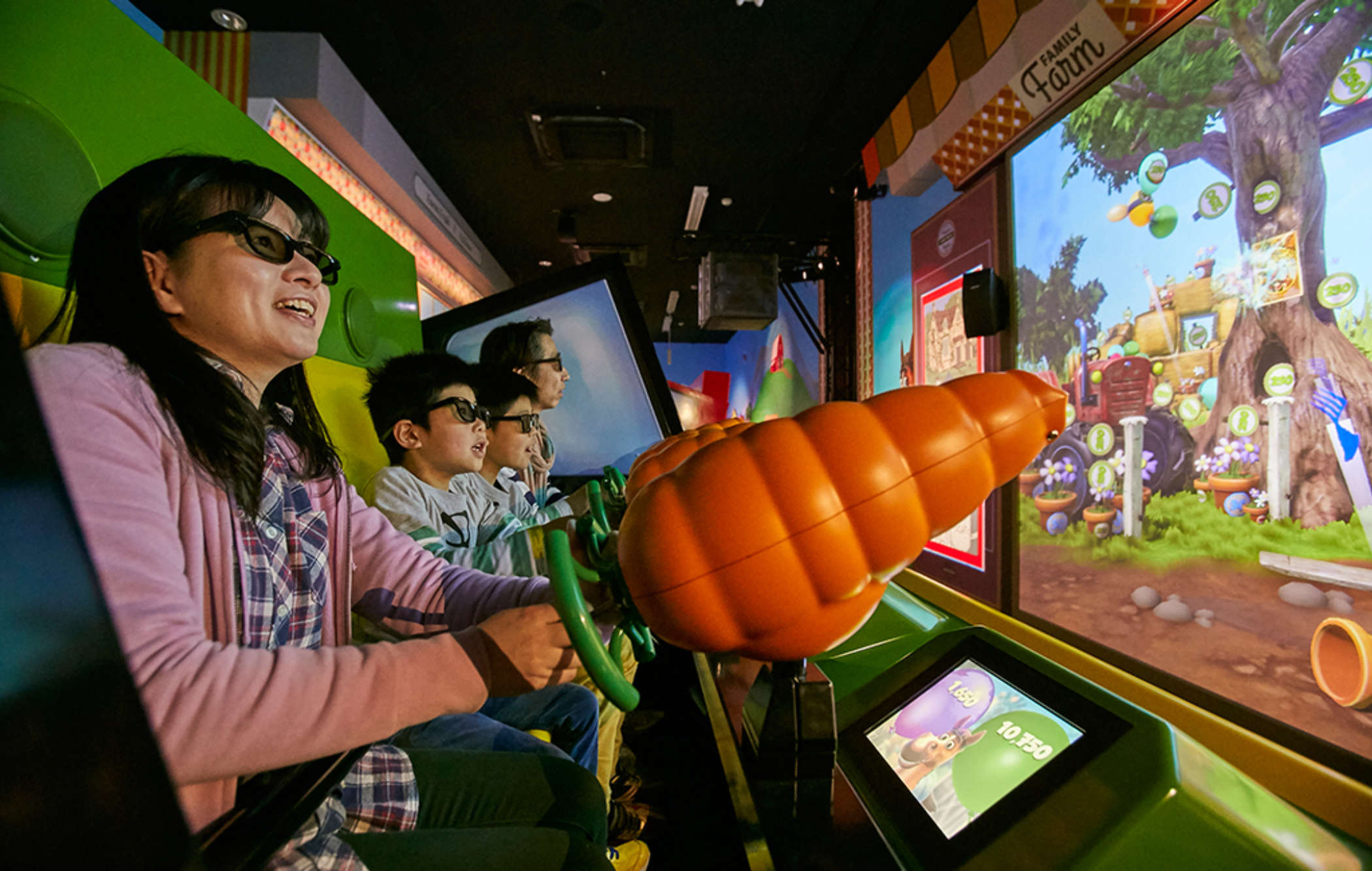 The real-time video game is based on full HD quality graphics. Targets appearing in the game show the number of points that can be scored. Once a target has been hit, it will give a visible effect to the player in real time. This is the art of interactivity and gives players the feeling of a real game in which they actually interact and change the gameplay! In addition, they are awarded with points for every hit. The funny game scenes take players to different locations at the farm, such as the meadow, barn, kitchen and vegetable garden. Some of them are especially designed for Nagashima Spa Land!